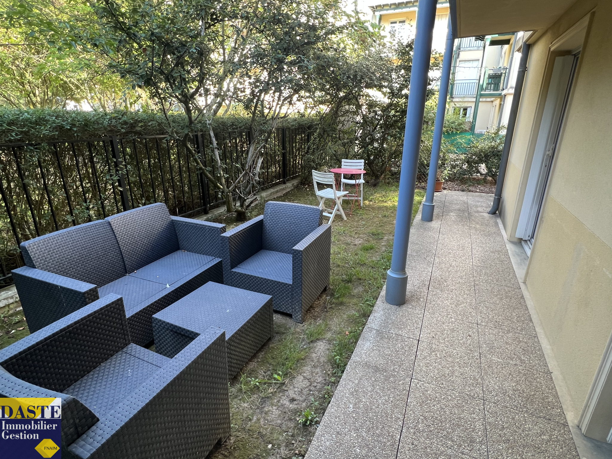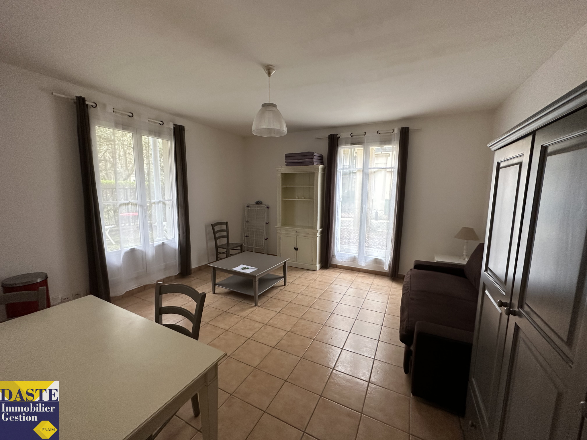 dans immeuble sécurisé : Entrée, séjour donnant sur jardin et terrasse orientée sud/ ouest, cuisine ouverte équipée, salle de bains.