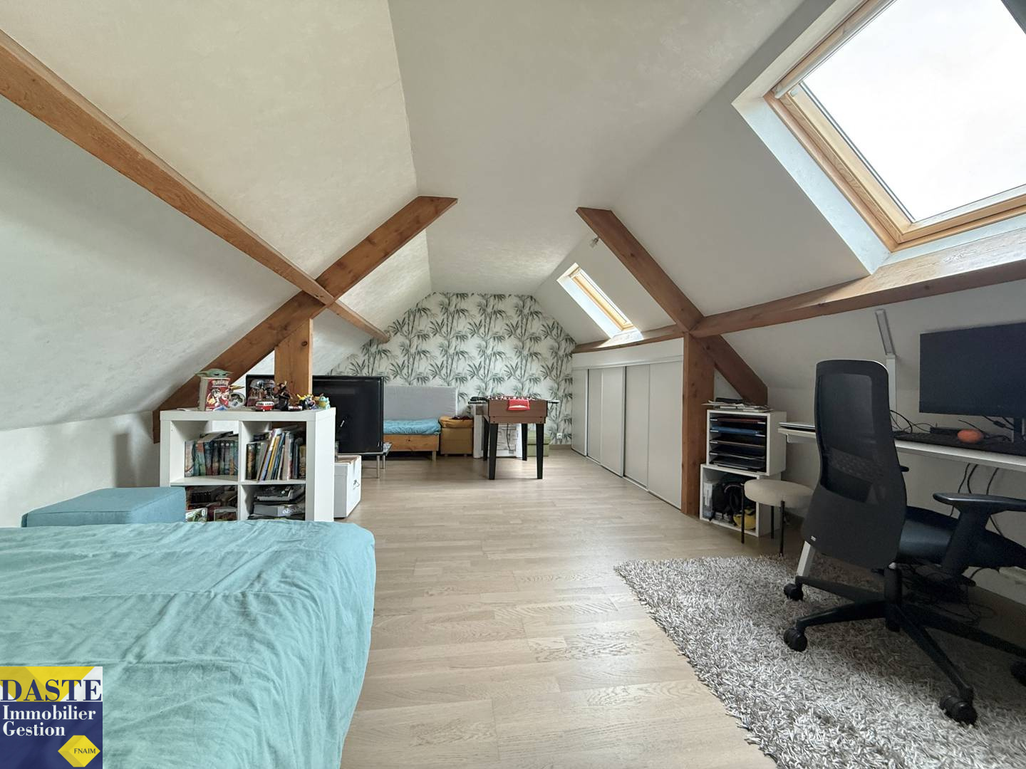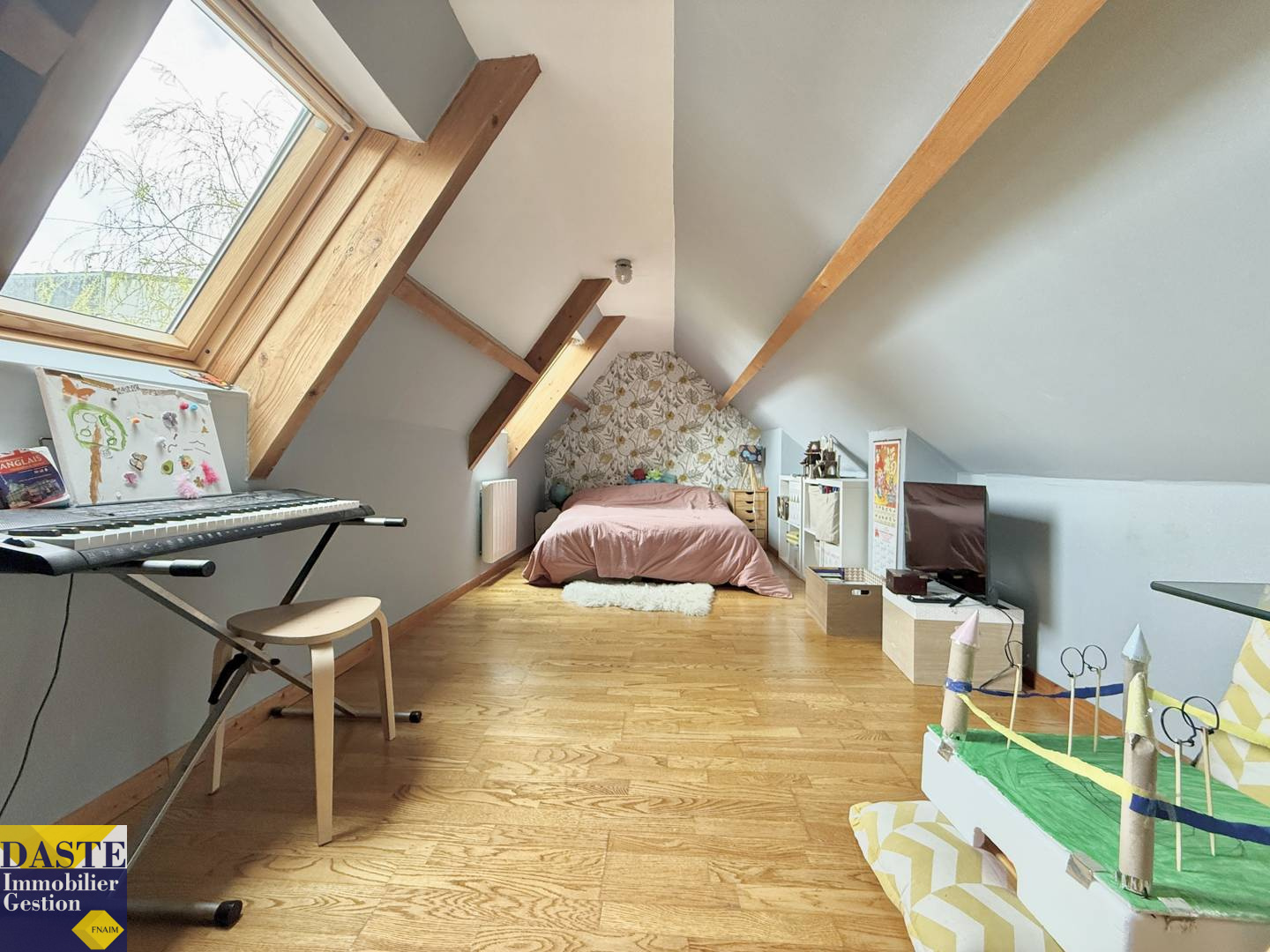 A l'étage, combles aménagés en deux grandes chambres, salle d'eau avec wc.