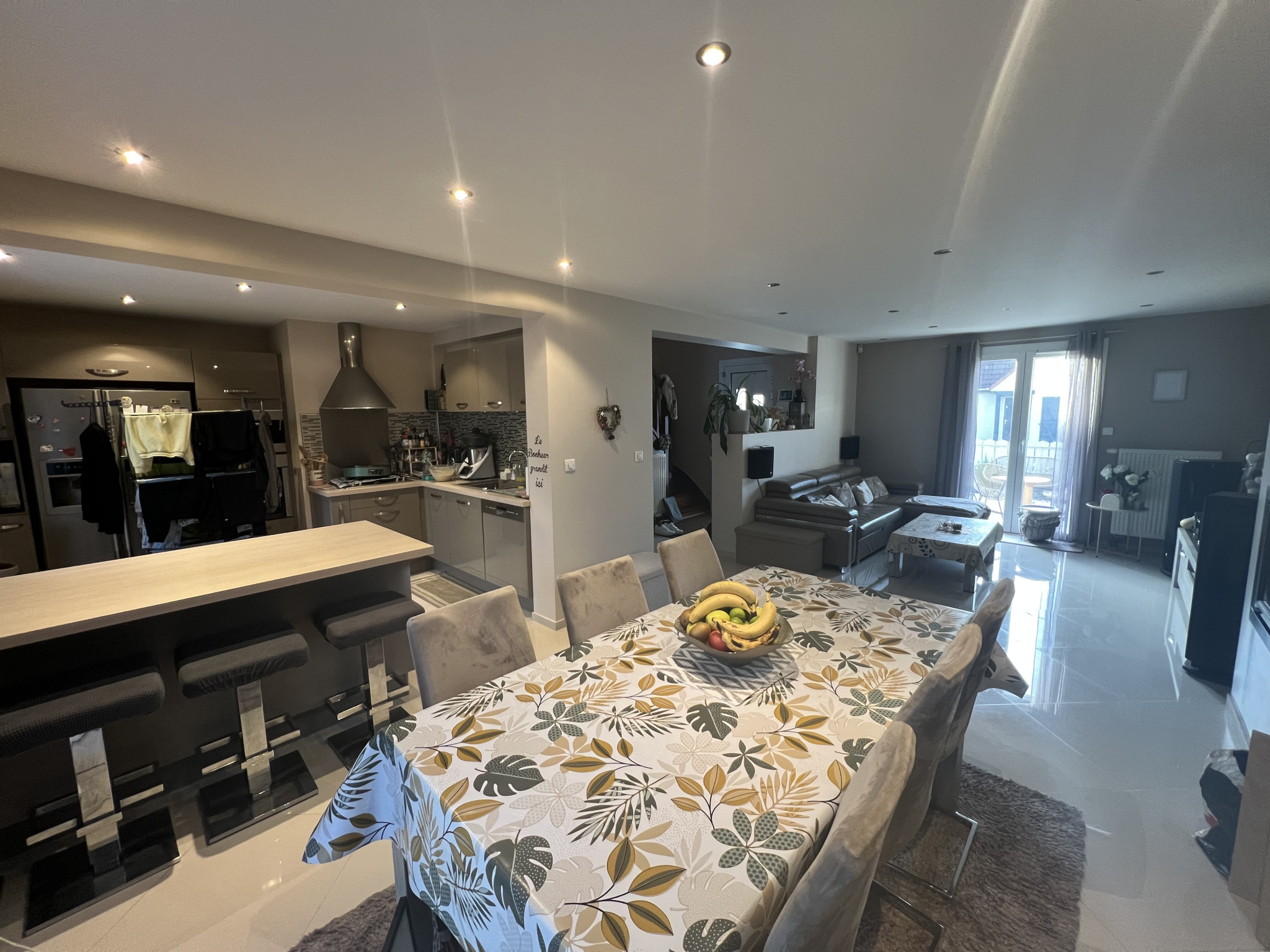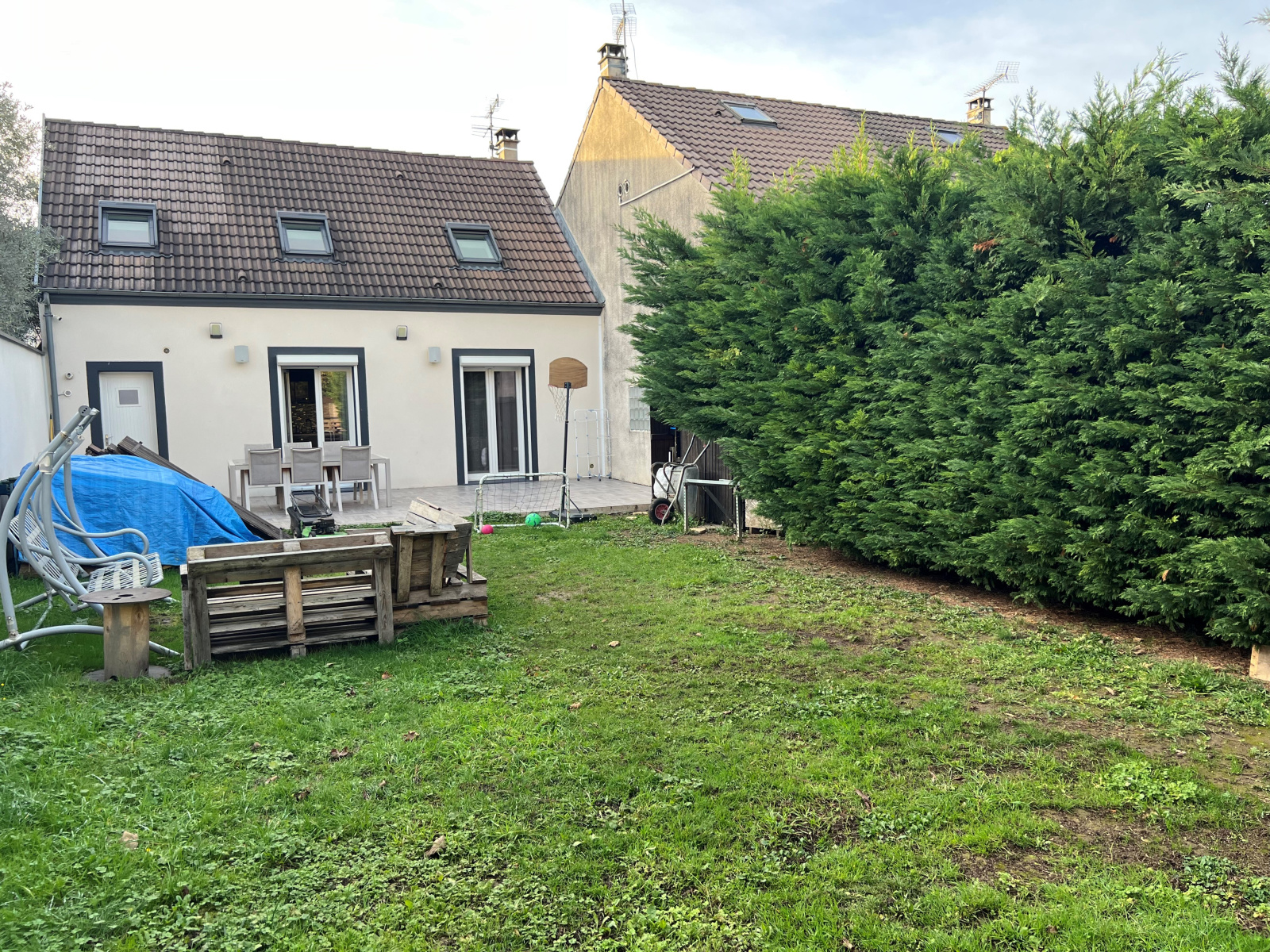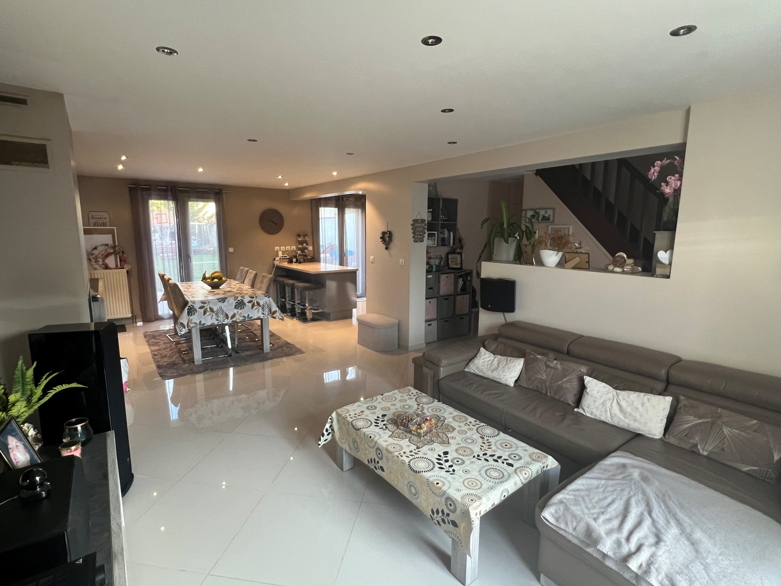 Entrée, séjour double avec cheminée sonnant sur jardin clos sans visà vis, cuisine ouverte améagée et équipée, wc et granbde lingerie.